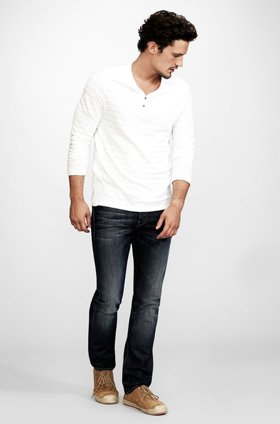 A primeira coisa que você pode incluir é uma camisa Henley, que aliás acabei de mencionar neste post, pois trata-se de uma camiseta com um pequeno detalhe na gola que dá um charme a mais na peça sem soar muito afetado. O jeans também pode sair das lavagens comuns e cores médias, lançando mão de um denim mais escuro com desgastes fortes e em lugares estratégicos. Para fechar um tênis clássico (All Star, Vans Old School, etc), mas que também traga um algo a mais, como um visual “vintage” ou “dirty”, com tiras de couro no lugar dos tradicionais cadarços, por exemplo.