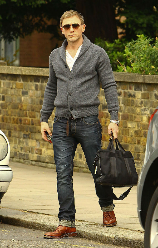 Embora alguns tenham um certo receio do cardigã, a peça, quando bem utilizada, pode deixar o look bem mais interessante. Nesta foto vemos o ator Daniel Craig, o atual James Bond, com um visual bem casual, ideal para o cotidiano, mas que não deixa de ser bacana.