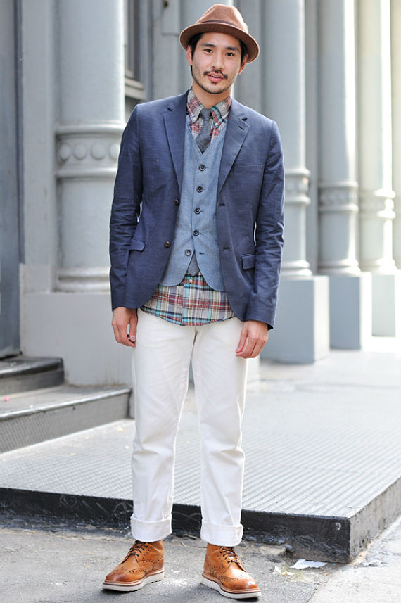 As texturas dos tecidos e os tons de azul, tanto do blazer, quanto do colete funcionam muito bem juntos, o xadrez da camisa enriqueceu a combinação e suas cores fizeram um belo contraste com as peças que estão por cima, a gravata apesar de ser cinza também tem uma certa textura, contando a favor, a calça em sarja branca deu leveza ao combo e se mostrou uma boa escolha mesmo não sendo algo muito comum no guarda roupa masculino, a bota brogue em tom caramelo mantém o tom divertido e leve, o chapéu, cuja cor contrasta com o paletó e o colete que são predominantes, fecha o combo com perfeição.