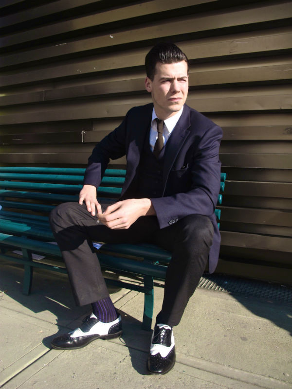 O camarada na foto acima partiu para a queda de braço com as regras de estilo e saiu vencedor, com louvor! Misturou um blazer marinho com uma calça preta e trocou os tradicionais sapatos pretos por um brogue bicolor, até então nenhuma transgressão absurda, mas o que me impressionou foram as meias combinando não com a calça, nem com o sapato, mas sim com o paletó, jogando para o alto uma das regras de ouro dos trajes sociais masculinos.