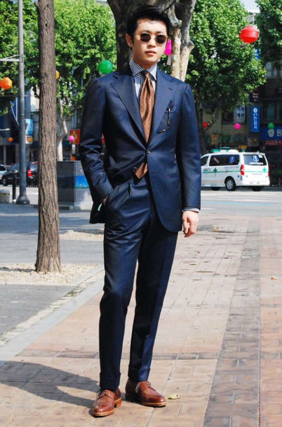 Claro que além disso nosso amigo oriental é bastante estiloso, está usando óculos adequados para seu tipo de rosto, um terno bem cortado – com uma pequena ressalva ao acabamento dos ombros – o nó da gravata parece ser um four-in-hand, pequeno e bastante adequado para este tipo de colarinho, que é o italiano, a discreta micro estampa da gravata dá um charme a mais a ela, fazendo que sobressaia sem ficar espalhafatosa, a camisa, com listras da mesma cor do terno, deixa a composição mais interessante, o sapato, obviamente, também é marrom e o correto é que seja usado com uma meia marinho.