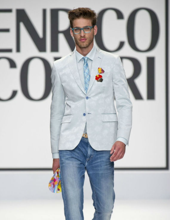 O primeiro item que nos chama a atenção é o blazer cropped (mais curto) em tons claros e com um quadriculado bem discreto, na mesma pegada vem a gravata e o jeans com uma lavagem clara e estilosa. Mesmo sem conseguir ver o sapato podemos supor que deve ser um oxford em camurça ou couro claro, seguindo a cor do discreto cinto. O detalhe da armação do óculos também é bastante interessante, apesar de alguns não gostarem de aros coloridos.
