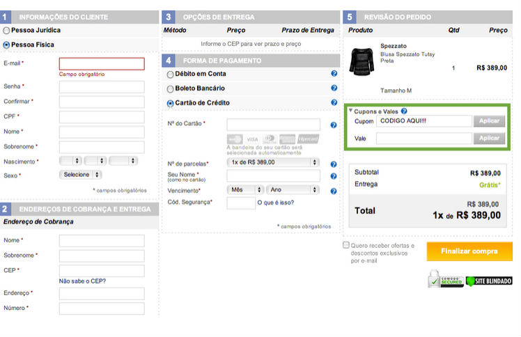 - Na hora de finalizar a compra, cole o código de desconto no campo “Cupons e Vales”!