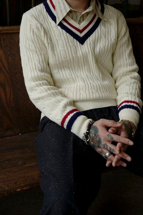 - Suéteres com gola V destacada por listras ou por cor contrastante;
