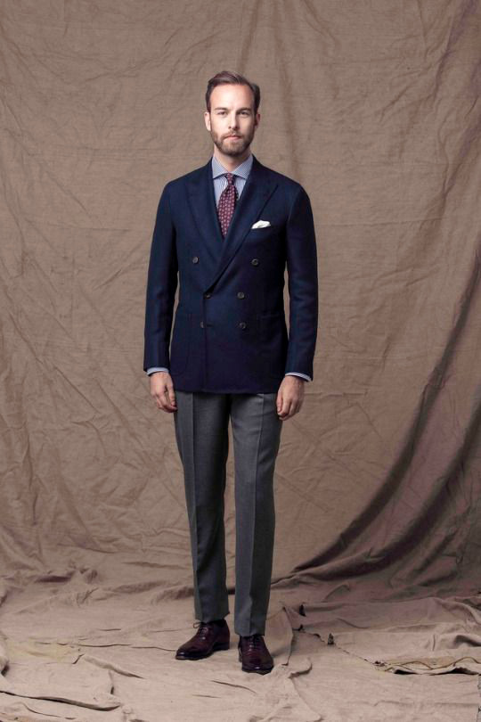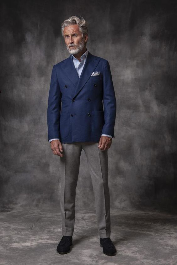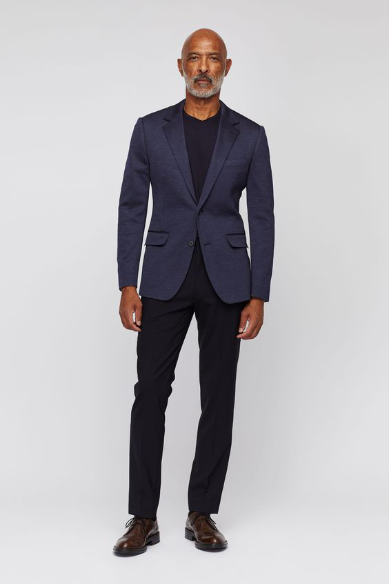 É melhor que as peças tenham contraste, se juntar dois itens de tons semelhantes vai ficar parecendo que um deles desbotou. Um paletó marinho (fazendo as vezes de blazer) combinado com uma calça cinza médio mostram que, na verdade, você está combinando alfaiataria!