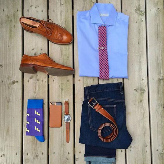 Este visual é praticamente uma versão mais casual do look anterior, com o jeans entrando no lugar da calça de alfaiataria. A gravata com xadrez vichy ajuda a dar uma descontraída e deixa o conjunto mais atraente para o olhar. A opção sem cinto da foto é arriscada em ambiente profissional, pode dar um ar muito relax, guarde-a para uma ocasião que não envolva trabalho.