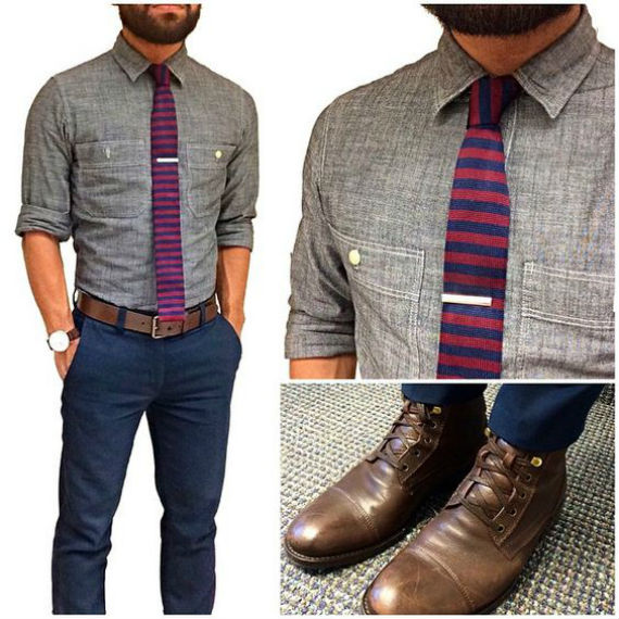 A gravata é um ótimo recurso para complementar o visual double jeans, ou seja camisa e calça em denim. Você pode optar por uma peça discreta (cinza ou marinho) ou criar contraste com cores como vermelho, marrom ou até laranja. É importante frisar que este é um traje muito casual e descolado, só use no trabalho se o dress code do local for totalmente liberal, caso contrário reserve esse look para uma balada ou um encontro.