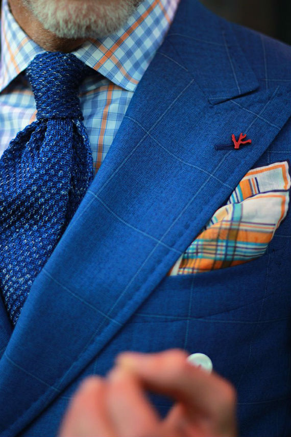 Uma coisa é usar um lenço de algodão branco, outra coisa é escolher cuidadosamente um exemplar de seda cuja cor contrastante dará um destaque todo especial ao costume. Este é um bom exemplo de quando um item clássico se torna moderno devido a maneira como é usado.