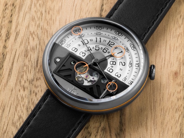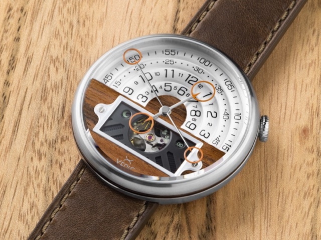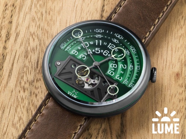Uma das características visuais mais marcantes do Halograph, tanto em sua versão original, quanto neste relógio aprimorado, é a marcação de tempo feita em arcos e ponteiros com extremidades em forma de aro, como só metade do painel tem os números de horas e minutos, cada meia volta de um ponteiro reinicia o ciclo em um arco diferente, complementando o horário anterior.