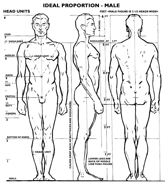 A primeira coisa que você deve saber é que o corpo humano é incrivelmente proporcional e as roupas que você usa precisam respeitar essa proporção. Existem alguns padrões de tamanhos que se aplicam a todo mundo, com variações mínimas, como por exemplo a altura de uma pessoa que é equivalente a 7 ½ vezes a altura de sua cabeça (pode ser 8X em alguns casos) ou a largura dos ombros que tem 2 vezes essa medida básica. Na imagem acima é possível ver claramente essa relação.