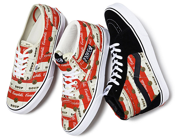 Em mais uma parceria, a loja Supreme, com endereços em Nova York, Los Angeles e Londres, e a Vans, conhecida por seus tênis com DNA skater, lançaram uma versão dos consagrados modelos SK8 Hi, Half Cab e Authentic com um dos maiores ícones da pop art: o rótulo da sopa em lata Campbell’s. A embalagem em questão se tornou mundialmente reconhecida quando o artista pop Andi Warhol a usou em uma de suas obras e a partir daí, como qualquer coisa criada pelo novaiorquino, foi reproduzida em capas de revistas, camisetas posters passando por uma infinidade de produtos até finalmente chegar aos pés dos jovens pela iniciativa das duas marcas.